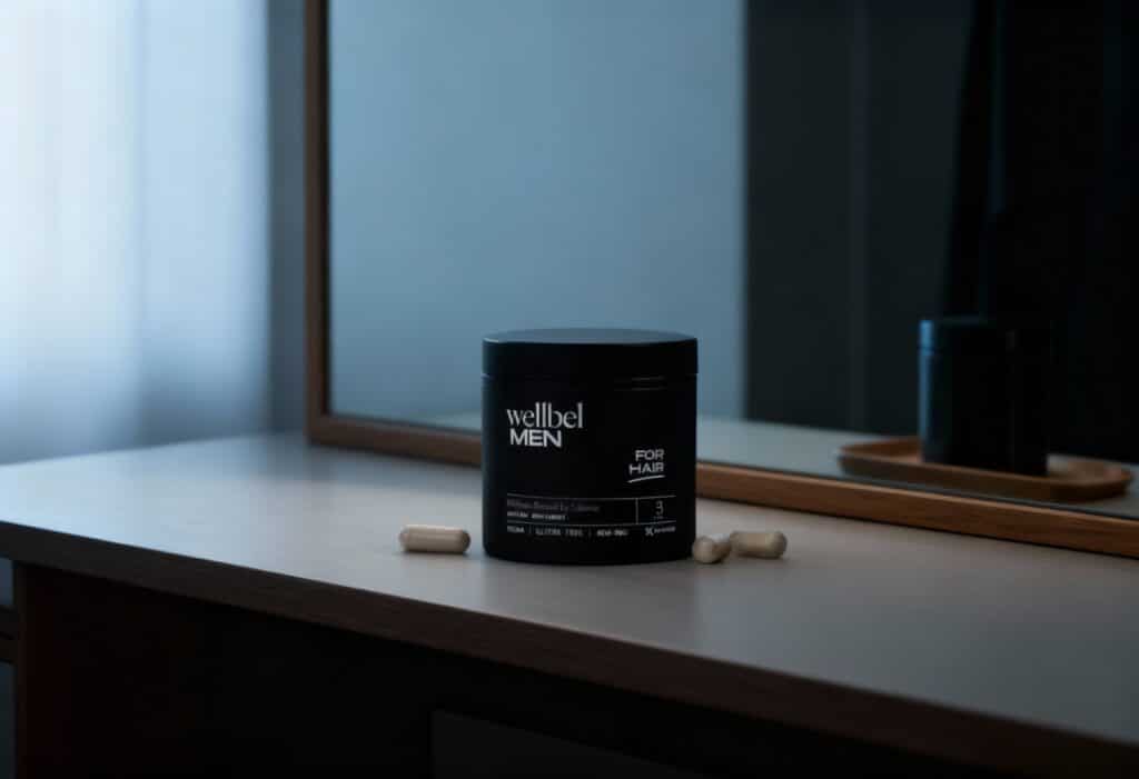 A mix of detox shampoo, thickening spray and daily Wellbel MEN supplements.